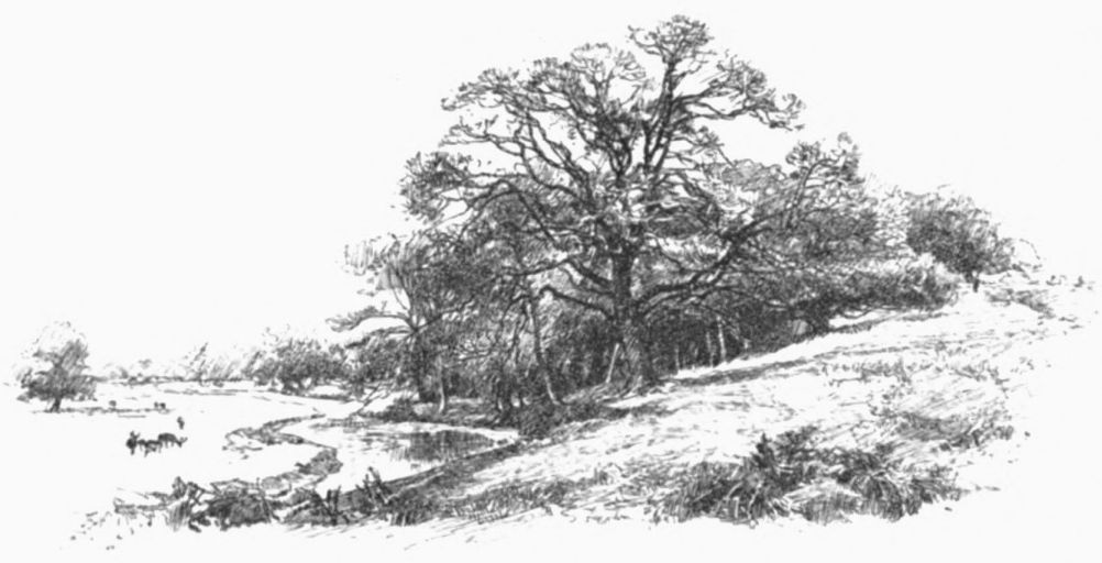 Below Stanford the stream contracts again, and again meanders among black cattle and green fields to Lilburne. Here it winds past a congeries of grassy mounds, dotted now with black-faced sheep, that was once a Roman encampment, the Tripontium mentioned by the emperor Antoninus in his journey from London to Lincoln. Climbing to the eminence of the prætorium and gazing westward, we see on the high ground two beech-crowned tumuli side by side, clearly an outpost or speculum overlooking Watling Street, the Roman road that passes just beyond the ridge “from Dover into Chestre.” This same high ground is the eastern hem of Dunsmore Heath, once so dismally ravaged by the Dun Cow of legend, till Guy of Warwick rode out and slew her in single combat. The heath, a long ridge of lias bordering our river to the south for many miles to come, is now enclosed and tilled; but its straggling cottages, duck{16} ponds, and furze clumps still suggest the time when all was common land.