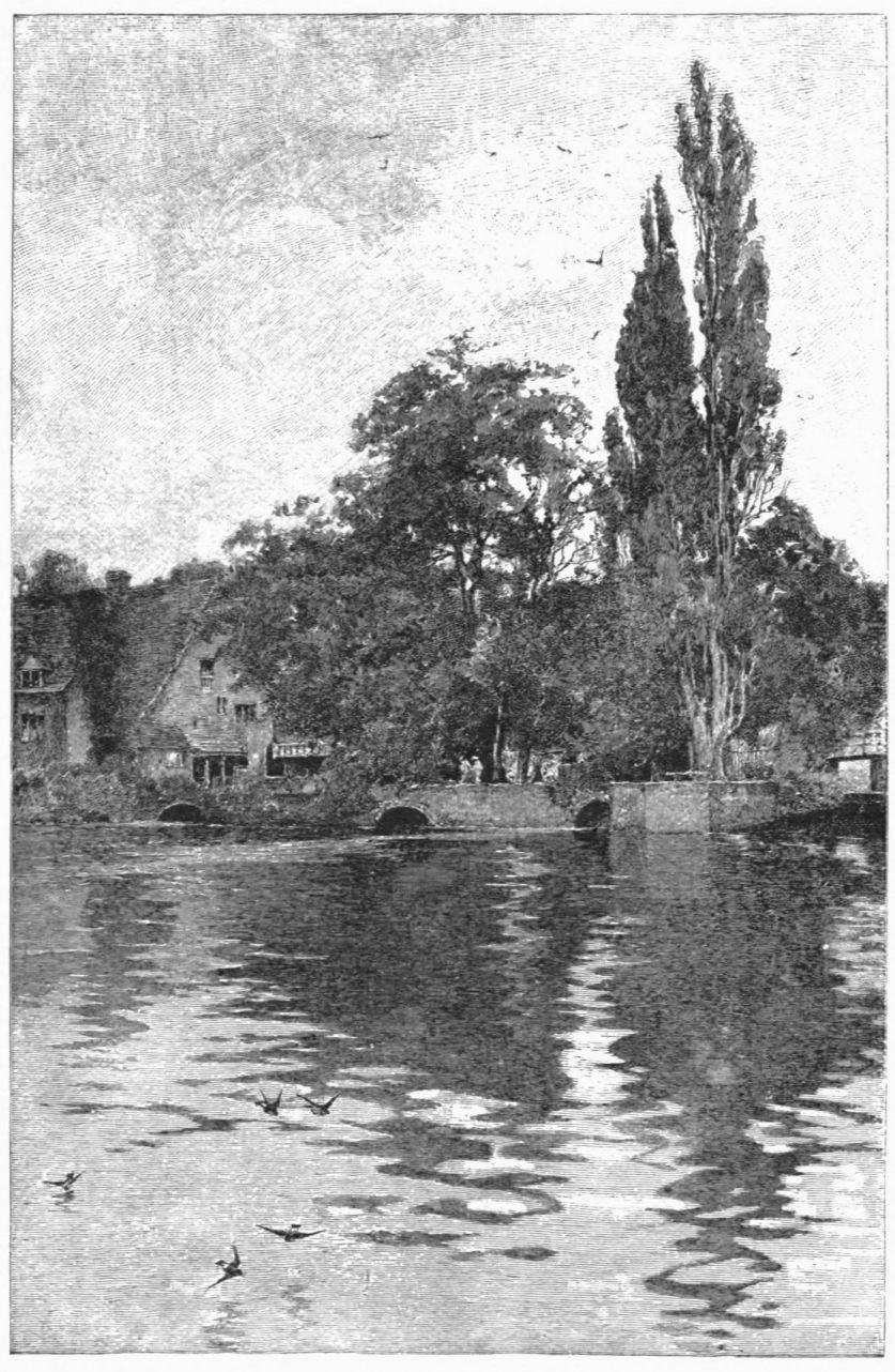 “There,” says Camden, “have yee a shady little wood, cleere and cristal springs, mossie bottoms and caves, medowes alwaies fresh and greene, the river rumbling heere and there among the stones with his streame making a milde noise and gentle whispering, and, besides all this, solitary and still quietness, things most grateful to the Muses.” Fuller, who knew it well, calls it “a most delicious place, so that a man in many miles’ riding cannot meet so much variety as there one furlong doth afford.” The water-mill is mentioned in Domesday-book, and has been sketched constantly ever since—a low, quaint pile, fronted by a recessed open gallery, under which the water is forever sparkling and frothing, fresh from its spin over the mill-wheels, or tumble down the ledges of the weir.