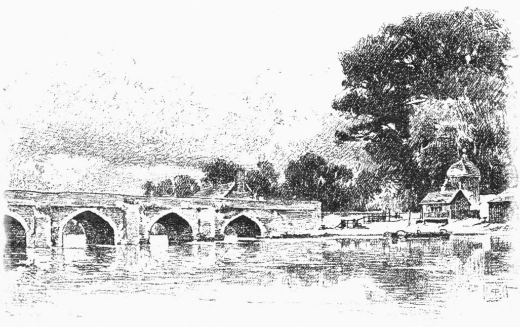 Nearly opposite lies Newnham Regis, about a mile from its baths. In Saxon times, they say, a king’s palace stood here; and three large fish-ponds, with some mounds, remain for a sign of it. Here, beside a pleasant mill, the foot-path crosses to Church Lawford. Just below, the stream is blocked by an osier bed; and we struggled there for the half of one mortal hour, and mused on the carpet slippers, and Hope, and such things; and “late and at last” were out and paddling through the uncertain light under the pointed arches of Bretford Bridge.