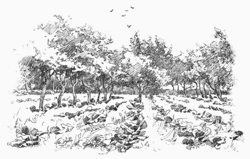 In the stubble the crack! crack! of a stray gun speaks, now and again, of partridge-time. Over the pastures, undulating with ridge and furrow, where the black oxen feed, patches of gloom and gleam are scurrying as the wind—westerly, with a touch of north—chases the light showers under a vivid sun. Along the drab road darts a bullfinch, his family after him; pauses a moment among the dogrose berries; is off again, and lost in the dazzle ahead.