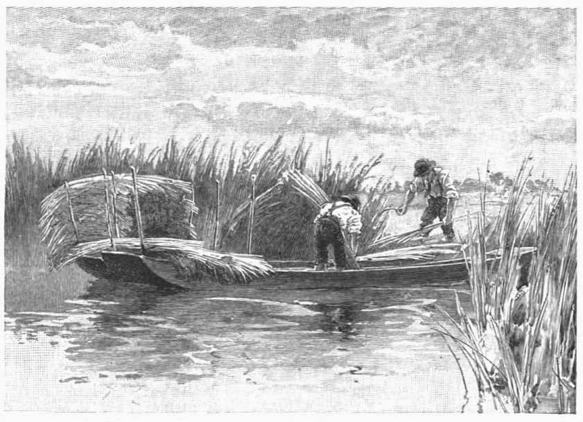 Leaving Lawford, we paddle through a land pastorally desolate, seeing, often for miles together, neither man’s face nor woman’s. The canoe darts in and out of rush beds; avoids now a shallow, now a snag, a clump of reeds, a conglomerate of logs and pendent shrivelled flags, flotsam of many floods; and again is gliding easily between meadows that hold, in Touchstone’s language, “no assembly but horn beasts.” Our canoe wakes strange emotions in these cattle. They lift their heads, snort, fling up their heels, and, with rigid tails, come capering after us like so many bacchanals. At length a fence stops them, and they obligingly watch us out of sight. The next herd repeats the performance. And always the river is vocal beside us,