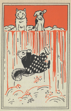 Then Frisky Squirrel’s heart almost stood still. That small animal was coming right up the tree after him! Of course, it wasn’t a dog at all. It was Farmer Green’s cat. Frisky had never seen a cat before and he began to wonder whether the small creature could fly, as well as climb trees. He scampered to the top of the tree; and then he leaped upon a branch of another tree close by.