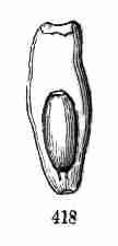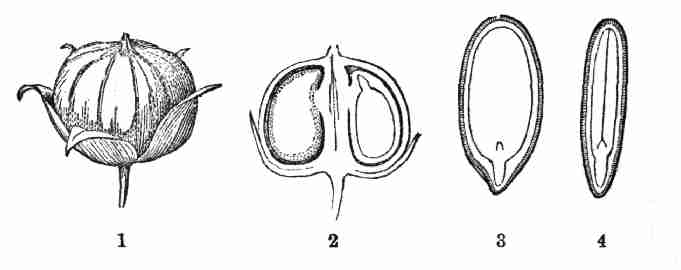 Fig. 1. Pod of Flax. 2. Section lengthwise, showing two of the seeds; one whole, the other cut half away, bringing contained embryo into view. 3. Similar section of a flax-seed more magnified and divided flatwise; turned round, so that the stem-end (caulicle) of the embryo is below: the whole broad upper part is the inner face of one of the cotyledons; the minute nick at its base is the plumule. 4. Similar section through a seed turned edgewise, showing the thickness of the cotyledons, and the minute plumule between them, i. e. the minute bud on the upper end of the caulicle.