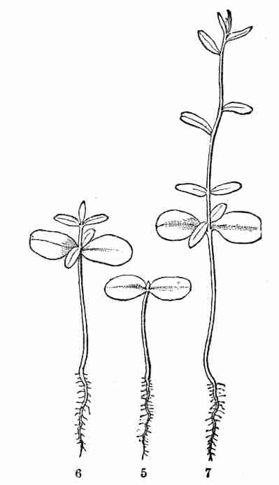Fig. 5. Early Flax seedling; stem (caulicle), root at lower end, expanded seed-leaves (cotyledons) at the other: minute bud (plumule) between these. 6. Same later; the bud developed into second pair of leaves, with hardly any stem-part below them; then into a third pair of leaves, raised on a short joint of stem; and a fifth leaf also showing. 7. Same still older, with more leaves developed, but these singly (one after another), and with joints of stem between them.