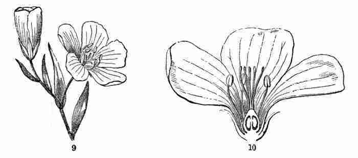 Fig. 9. Flax-flowers about natural size. 10. Section of a flower moderately enlarged, showing a part of the petals and stamens, all five styles, and a section of ovary with two ovules or rudimentary seeds.