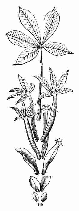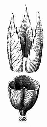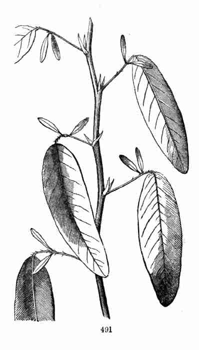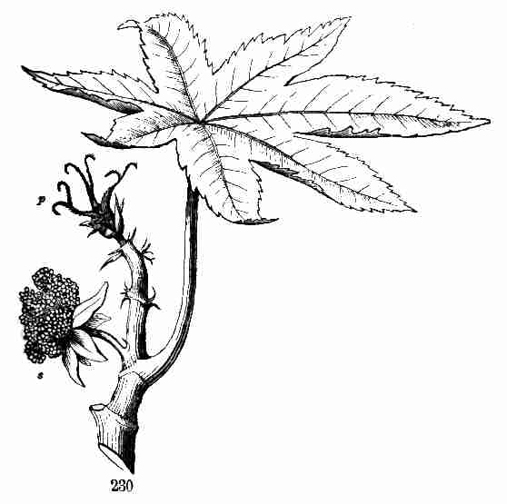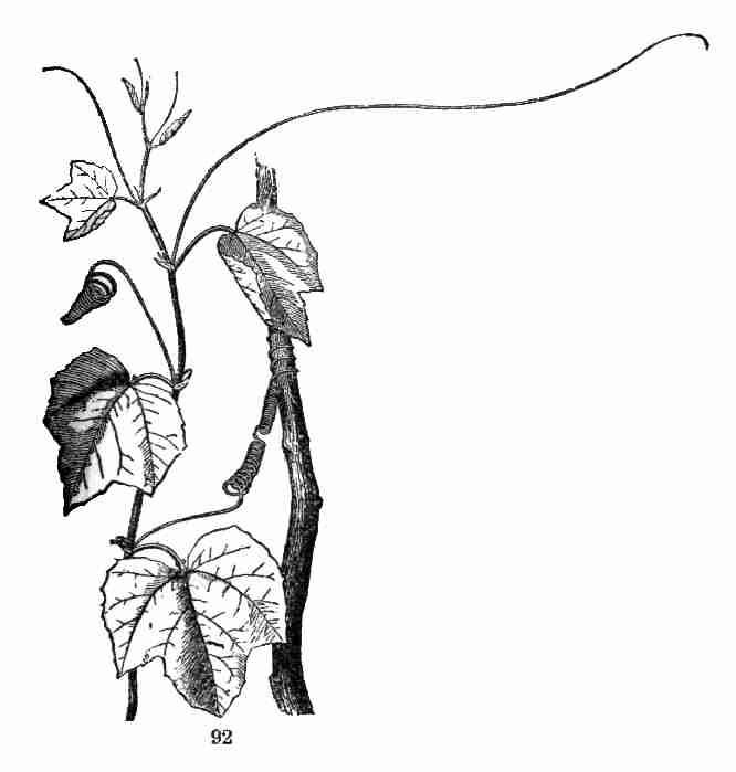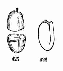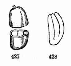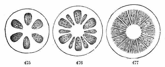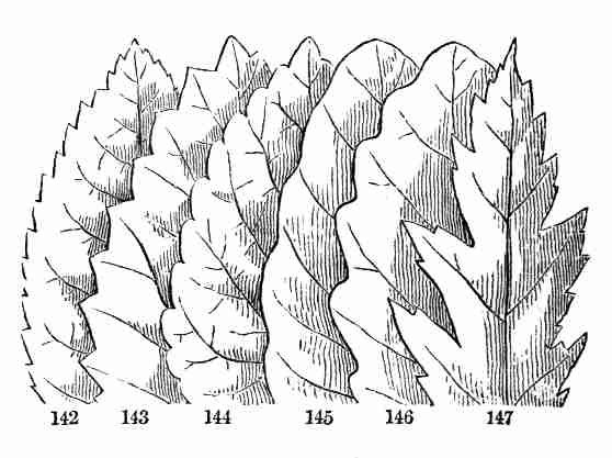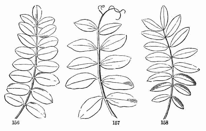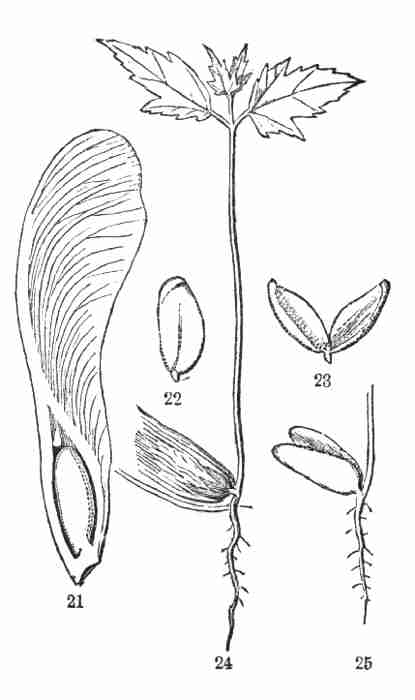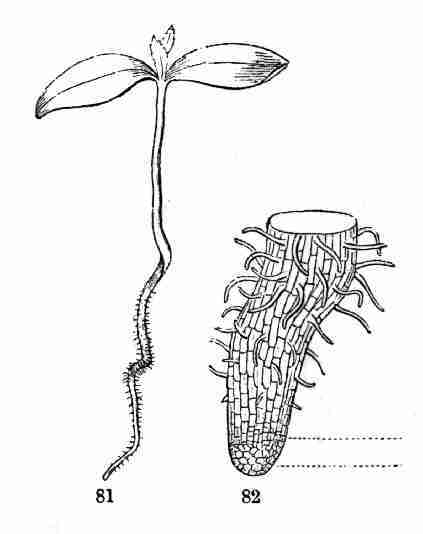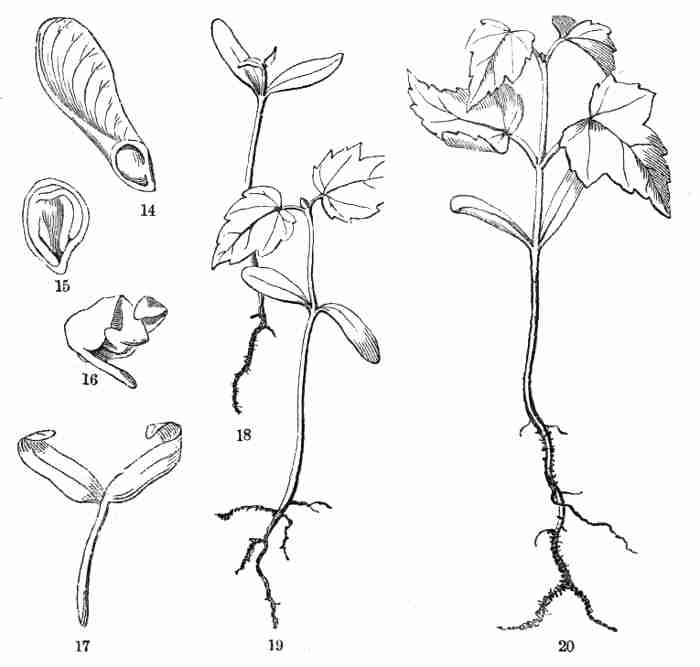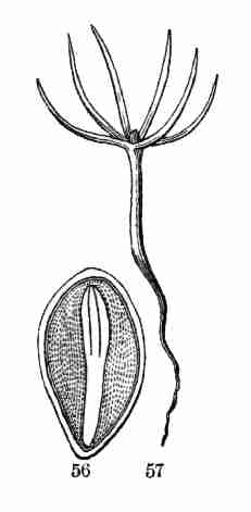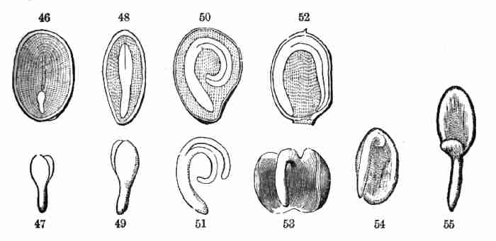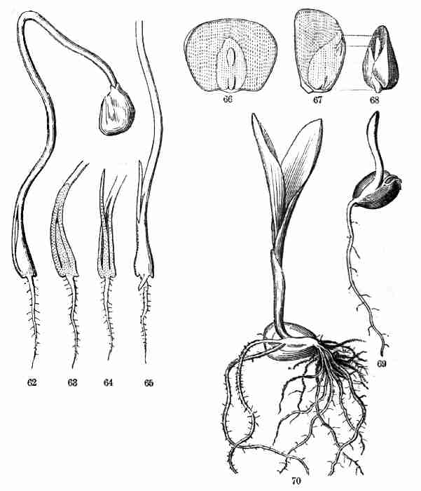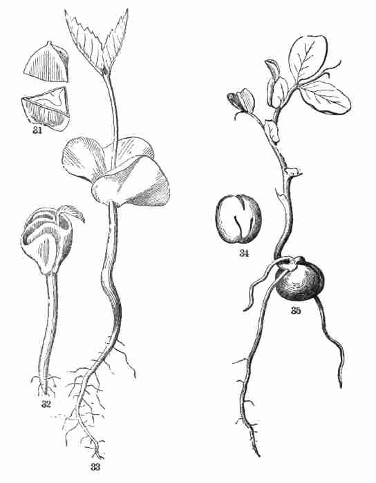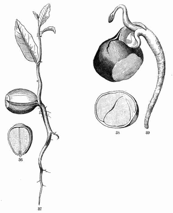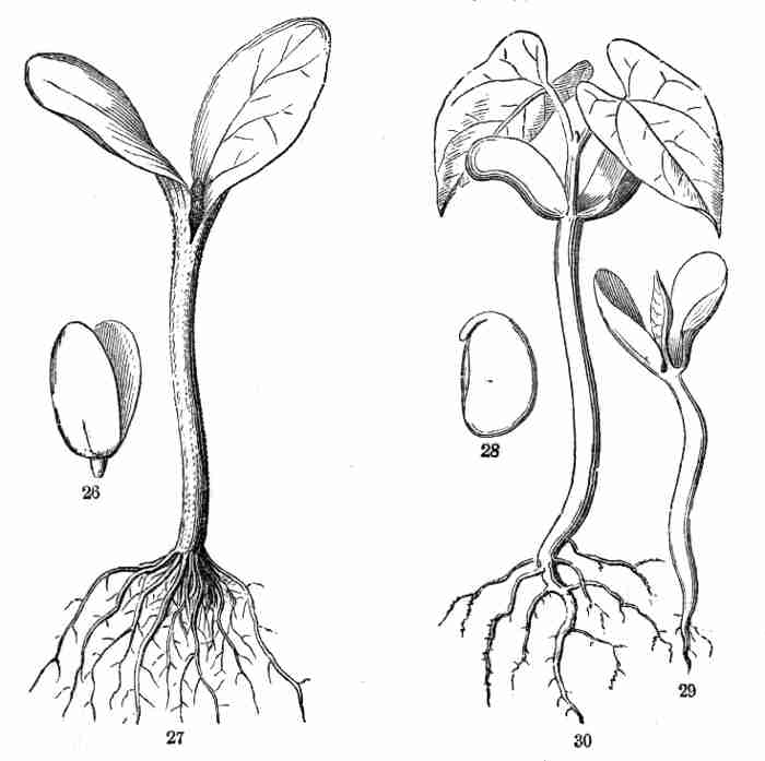 11. On committing these seeds to moist and warm soil they soon sprout, i. e. germinate. The very short stem-part of the embryo is the first to grow. It lengthens, protrudes its root-end; this turns downward, if not already pointing in that direction, and while it is lengthening a root forms at its point and grows downward into the ground. This root continues to grow on from its lower end, and thus insinuates itself and penetrates into the soil. The stem meanwhile is adding to its length throughout; it erects itself, and, seeking the light, brings the seed up out of the ground. The materials for this growth have been supplied by the cotyledons or seed-leaves, still in the seed: it was the store of nourishing material they held which gave them their thickish shape, so unlike that of ordinary leaves. Now, relieved of a part of this store of food, which has formed the growth by which they have been raised into the air and light, they appropriate the remainder to their own growth. In enlarging they open and throw off the seed-husk; they expand, diverge into a horizontal position, turn green, and thus become a pair of evident leaves, the first foliage of a tiny plant. This seedling, although diminutive and most simple, possesses and puts into use, all the Organs of Vegetation, namely, root, stem, and leaves, each in its proper element,—the root in the soil, the stem rising out of it, the leaves in the light and open air. It now draws in moisture and some food-materials from the soil by its root, conveys this through the stem into the leaves, where these materials, along with other crude food which these imbibe from the air, are assimilated into vegetable matter, i. e. into the material for further growth.