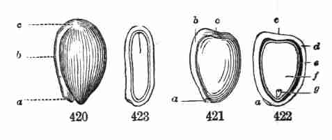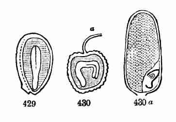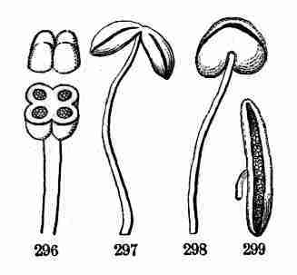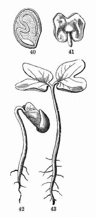 8. Growth from the Seed. Phanerogamous plants grow from seed, and their flowers are destined to the production of seeds. A seed has a rudimentary plant ready formed in it,—sometimes with the two most essential parts, i. e. stem and leaf, plainly discernible; sometimes with no obvious distinction of organs until germination begins. This incipient plant is called an Embryo.