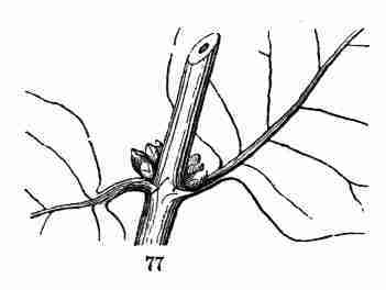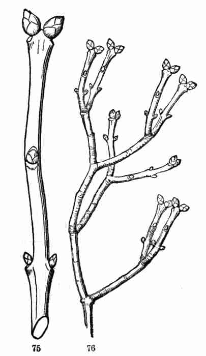 12. Further Growth soon proceeds to the formation of new parts,—downward in the production of more root, or of branches of the main root, upward in the development of more stem and leaves. That from which a stem with its leaves is continued, or a new stem (i. e. branch) originated, is a Bud. The most conspicuous and familiar buds are those of most shrubs and trees, bearing buds formed in summer or autumn, to grow the following [Pg 13]spring. But every such point for new growth may equally bear the name. When there is such a bud between the cotyledons in the seed or seedling it is called the Plumule. This is conspicuous enough in a bean (Fig. 29.), where the young leaf of the new growth looks like a little plume, whence the name, plumule. In flax-seed this is very minute indeed, but is discernible with a magnifier, and in the seedling it shows itself distinctly (Fig. 5, 6, 7).