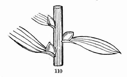 13. As it grows it shapes itself into a second pair of leaves, which of course rests on a second joint of stem, although in this instance that remains too short to be well seen. Upon its summit appears the third pair of leaves, soon to be raised upon its proper joint of stem; the next leaf is single, and is carried up still further upon its supporting joint of stem; and so on. The root, meanwhile, continues to grow underground, not joint after joint, but continuously, from its lower end; and commonly it before long multiplies itself by branches, which lengthen by the same continuous growth. But stems are built up by a succession of leaf-bearing growths, such as are strongly marked in a reed or corn-stalk, and less so in such an herb as Flax. The word "joint" is ambiguous: it may mean either the portion between successive leaves, or their junction, where the leaves are attached. For precision, therefore, the place where the leaf or leaves are borne is called a Node, and the naked interval between two nodes, an Internode.