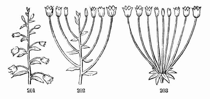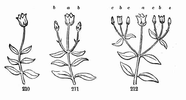 14. In this way a simple stem with its garniture of leaves is developed from the seed. But besides this direct continuation, buds may form and develop into lateral stems, that is, into branches, from any node. The proper origin of branches is from the Axil of a leaf, i. e. the angle between leaf and stem on the upper side; and branches may again branch, so building up the herb, shrub, or tree. But sooner or later, and without long delay in an annual like Flax, instead of this continuance of mere vegetation, reproduction is prepared for by
