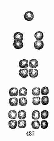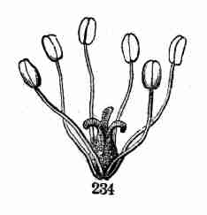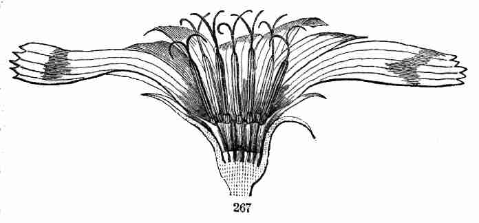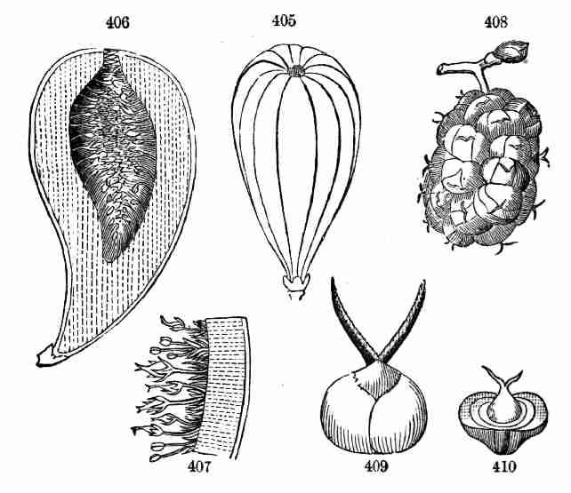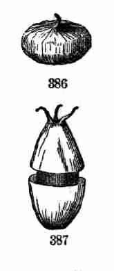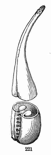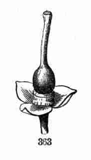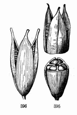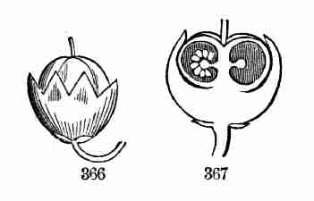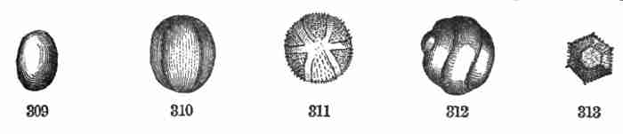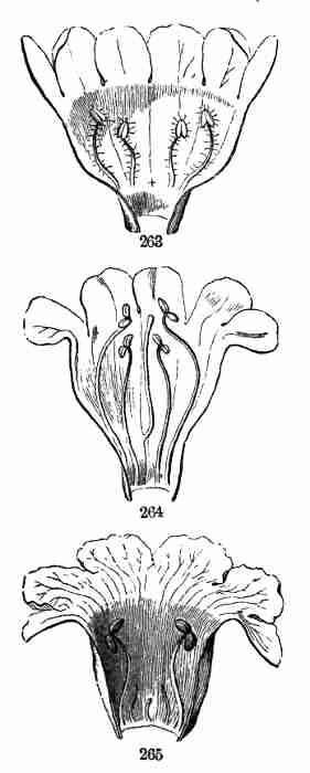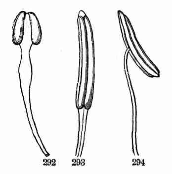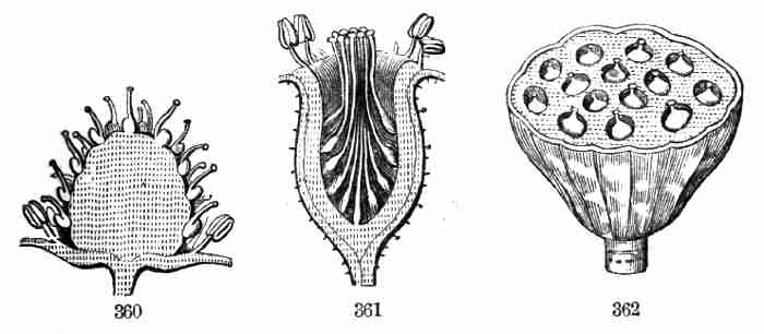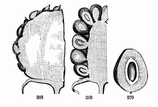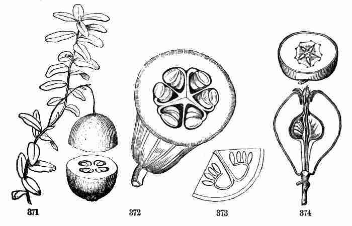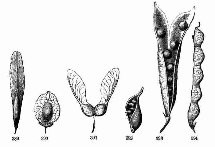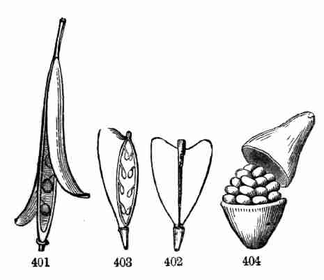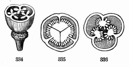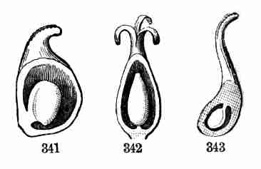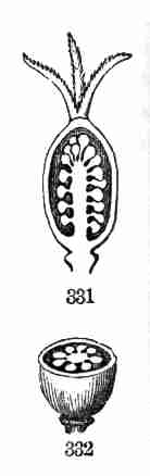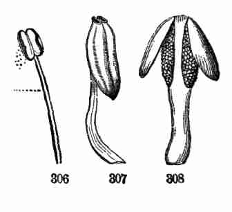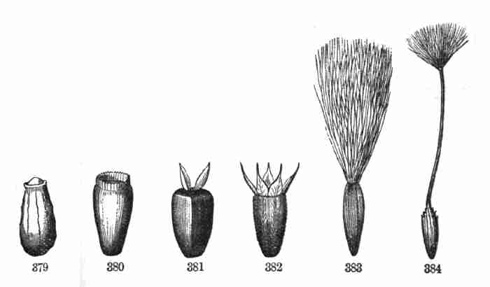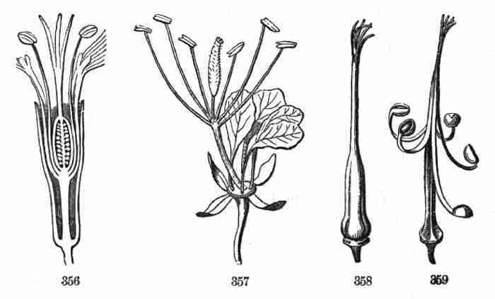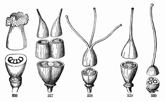 17. The pollen shed from the anthers when they open falls upon or is conveyed to the stigmas; then the pollen-grains set up a kind of growth (to be discerned only by aid of a good microscope), which penetrates the style: this growth takes the form of a thread more delicate than the finest spider's web, and reaches the bodies which are to become seeds (Ovules they are called until this change occurs); these, touched by this influence, are incited to a new growth within, which becomes an embryo. So, as the ovary ripens into the seed-pod or capsule (Fig. 1, etc.) containing seeds, each seed enclosing a rudimentary new plantlet, the round of this vegetable existence is completed.