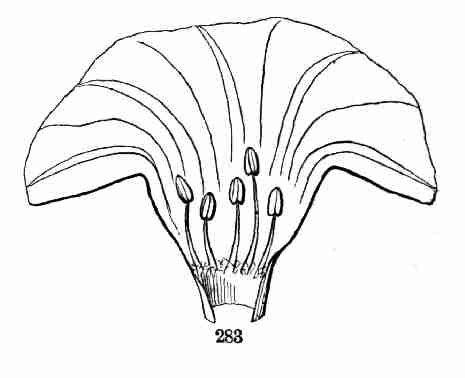 16. The Flower of Flax consists, first, of five small green leaves, crowded into a circle: this is the Calyx, or flower-cup. When its separate leaves are referred to they are called Sepals, a name which distinguishes them from foliage-leaves on the one hand, and from petals on the other. Then come five delicate and colored leaves (in the Flax, blue), which form the Corolla, and its leaves are Petals; then a circle of organs, in which all likeness to leaves is lost, consisting of slender stalks with a knob at summit, the Stamens; and lastly, in the centre, the rounded body, which becomes a pod, surmounted by five slender or stalk-like bodies. This, all together, is the Pistil. The lower part of it, which is to contain the seeds, is the Ovary; the slender organs surmounting this are Styles; the knob borne on the apex of each style is a Stigma. Going back to the stamens, these are of two parts, viz. the stalk, called Filament, and the body it bears, the Anther. Anthers are filled with Pollen, a powdery substance made up of minute grains.
