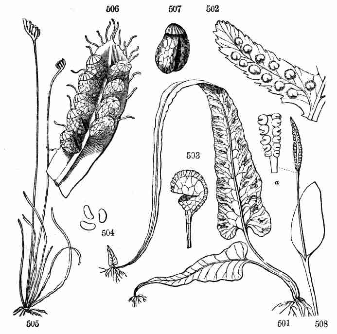 Cryptogamous Plants, or Cryptogams, come from minute bodies, which answer to seeds, but are of much simpler structure, and such plants have not stamens and pistils. Therefore they are called in English Flowerless Plants. Such are Ferns, Mosses, Algæ or Seaweeds, Fungi, etc. These sorts have each to be studied separately, for each class or order has a plan of its own.