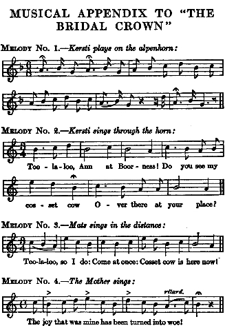 Both this little volume and the issues of "The Rune" must have come under the attention of Strindberg at an early period, and to both he remained strongly attached throughout life. In the pages of those two Dybeck publications he found almost everything that makes "The Bridal Crown" what it is—a remarkable picture of the external life and internal spirit of the Dalecarlian people. The musical duet between Kersti and Mats in the first scene is the basis of the whole play. It is found in Dybeck's work just as Strindberg has used it—both the music and the words. The legend has it that a young man and a young woman, herding cattle in adjoining pastures, fell in love with each other. The girl bore a child, which they nursed together as they best could, having tried to legitimise it by going through a simple wedding ceremony of their own improvisation. Once, when the girl could not get back to the pasture at night, she used her alpenhorn to communicate that fact to her lover and ask him to look after the baby. This legend is found all over Sweden in very slightly modified form.