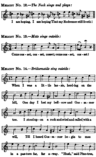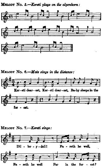 A typical feature of Dalecarlian life has always been the sending of the cattle to upland pastures during the summer months in care of young men and women, who, in communication among themselves as well as with the people at the home farm, have availed themselves of the ancient alpenhorn, or lur, made out of wood and birch bark, as well as of the horn made out of the natural horn of the ox. And instinctively they have realised that melodious utterance carries farther than ordinary speech, and so they have come to sing or hum their communications. Furthermore, they have grown accustomed to use some song already familiar to the listener rather than what they might improvise, and have thus learned to pass on simple pieces of news, or a mere mood, perhaps, in what might be called a code.