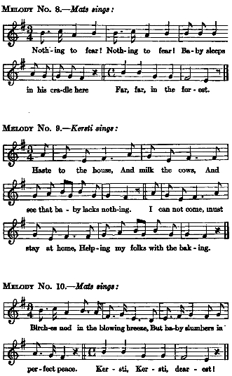 Melodies Nos. 1, 2, 3, 4, 5, 6, 7, 8, 9, 10, 12, 13, 14, 16, and 17 have been taken by Strindberg—without any changes—from Richard Dybeck's "Svenska Vallvisor och Hornlåtar" ("Swedish Herd-Songs and Horn-Melodies"), Stockholm, 1846.