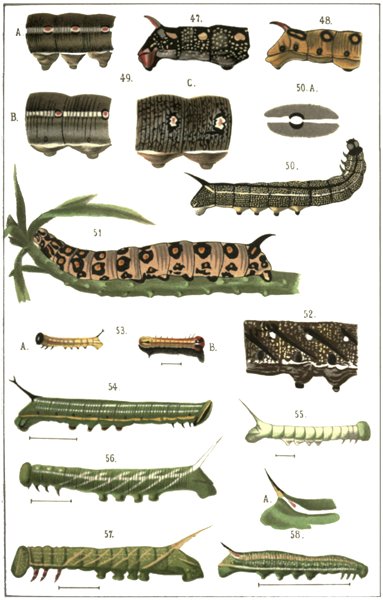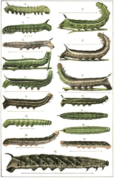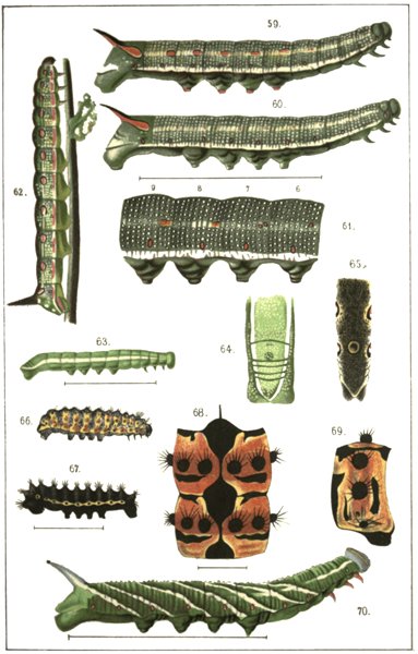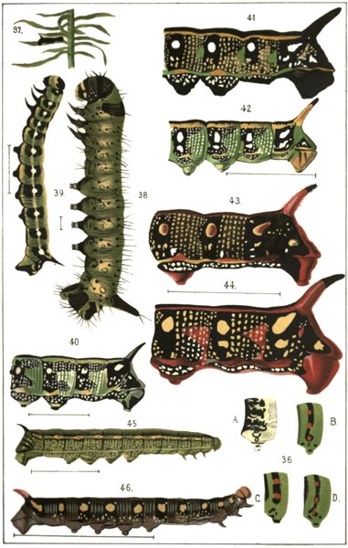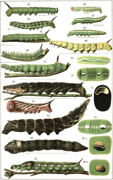 If with reference to the question as to the precise conditions of life in caterpillars I was frequently driven to my own observations, it was because I found as good as no previous work bearing upon this subject. It was well known generally that many caterpillars were differently marked and coloured when young to what they were when old; in some very striking cases brief notices of this fact are to be found in the works,1xxiv more especially, of the older writers, and principally in that of the excellent observer Rösel von Rosenhof, the Nuremberg naturalist and miniature painter. In no single case, however, do the available materials suffice when we have to draw conclusions respecting the phyletic development. We distinctly see here how doubtful is the value of those observations which are made, so to speak, at random, i.e. without some definite object in view. Many of these observations may be both good and correct, but they are frequently wanting precisely in that which would make them available for scientific purposes. Thus everything had to be established de novo, and for this reason the investigations were extended over a considerable number of years, and had to be restricted to a small and as sharply defined a group as possible—a group which was easily surveyed, viz. that of the Hawk-moths or Sphinges.