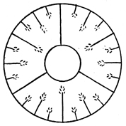 Here are foot-notes again, this time of real steps from real feet. . . . The imprints are in two parallel lines, an inch or so apart; each impression is two or three inches in advance of the next one behind; none of them are in pairs, but each one of one line is opposite the middle of the interval between two of the other line; they are steps as regular as a man's, only so small. Each mark is fan-shaped; it consists of three little lines less than an inch long, spreading apart at one extremity, joined at the other. At the joined end, and also just in front of it, a flat depression of the sand is barely visible. Now following the track, we see it run straight a yard or [pg004] more, then twist into a confused ball, then shoot out straight again, then stop, with a pair of the footprints opposite each other, different from the other end of the track, that began as two or three little indistinct pits or scratches, not forming perfect impressions of a foot. Where the track twisted there are several little round holes in the sand. The whole track commenced and finished upon the open sand. The creature that made it could not, then, have come out of either the sand or the water; it must have come down from the air—a two-legged flying thing, a bird. To determine this, and, next, what kind of bird it was, every one of the trivial points of the description just given must be taken into account. It is a bit of autobiography, the story of an invitation to dine, acceptance, a repast, an alarm at the table, a hasty retreat. A bird came on wing, lowering till the tips of its toes just touched the sand, gliding half on wing, half afoot, until the impetus of flight was exhausted; then folding its wings, but not pausing, for already a quick eye spied something inviting; a hasty pecking and probing to this side and that, where we found the lines entangled; a short run after more food; then a suspicious object attracted its attention; it stood stock-still (just where the marks were in a pair), till, thoroughly alarmed, it sprang on wing and was off.[2]