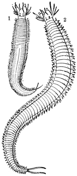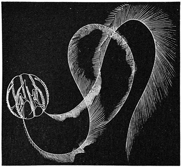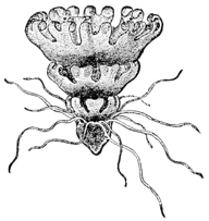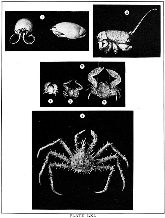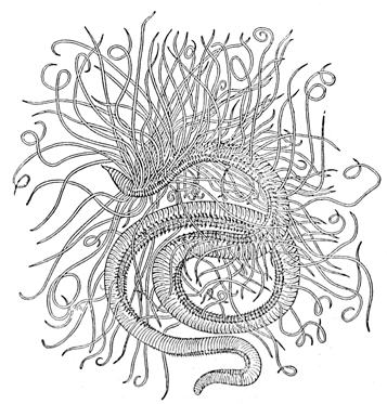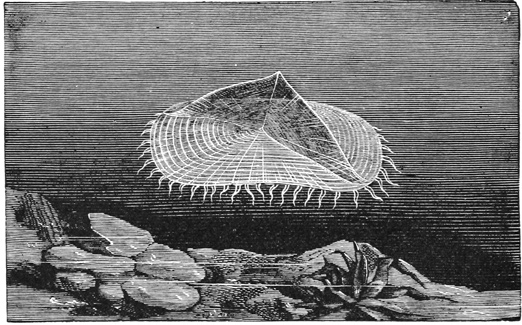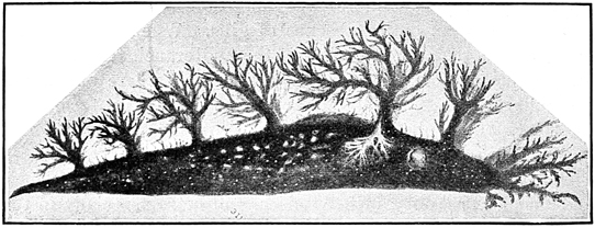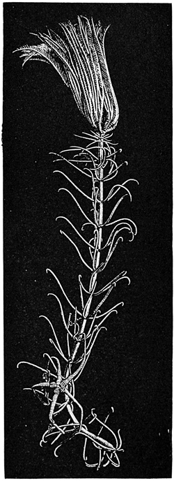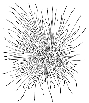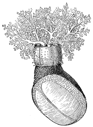 The water is crowded with creatures which prey upon one another, and all are interestingly adapted to their mode of life. Shore species are exceedingly abundant, and the struggle for life is there carried on with unceasing strife. In the endeavor to escape pursuers while they themselves pursue, these animals have various devices of armature and weapons of defense; they have keen vision, rapid motion, and are full of arts and wiles. One of the first resources for safety in this conflict is that of concealment. This is effected not only by actual hiding, but very generally by mimicry in simulating the color of their surroundings, and often by assuming other forms. Thus, for instance, the sea-anemone when expanded looks like a flower and is full of color, but when it contracts becomes so inconspicuous as to be with difficulty distinguished from the rock to which it is attached. Anemones also have stinging threads (nematophores), which they dart out for further defense. [pg007]