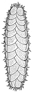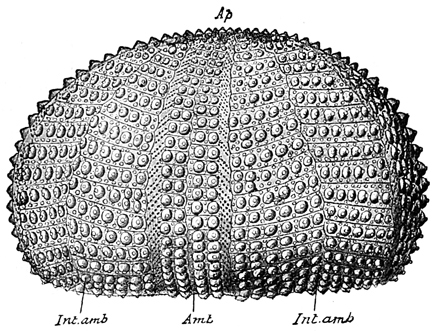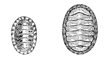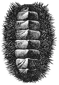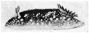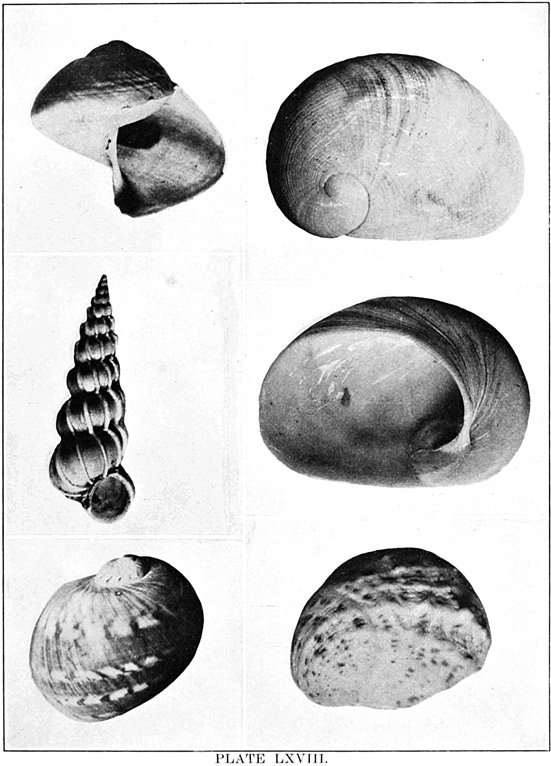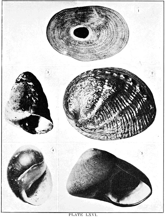 Mollusks, and other classes as well, differ in different latitudes. On the rocks of the Northern shores Littorina and Purpura shells are very abundant, the latter in various colors and beautifully striped. Limpets are also plentiful, but are not as conspicuous, since they have flat, disk-shaped shells. When their capture is attempted, they must be taken unawares and pushed quickly aside, else they take such a firm hold of the rock that it is difficult to dislodge them. Near low-water mark under ledges will perhaps be found chitons, which are easily recognized by their oval, jointed shells. On the California coast in like localities will be found the beautiful Haliotis, Acmæa, and chitons. Every stone that is lifted will disclose numbers of little amphipods (Gammarus), which will scuttle away on their sides to other shelter; worms will suddenly disappear into the mud, and perhaps a crab, here and there, having no alternative, will make a stand and fight for his liberty. Flat against the stone and not easily perceived may be a chiton, a planarian worm, or a nudibranch. And just below the water's edge are sea-urchins and starfishes, which grow in numbers as the eye becomes accustomed to the search.