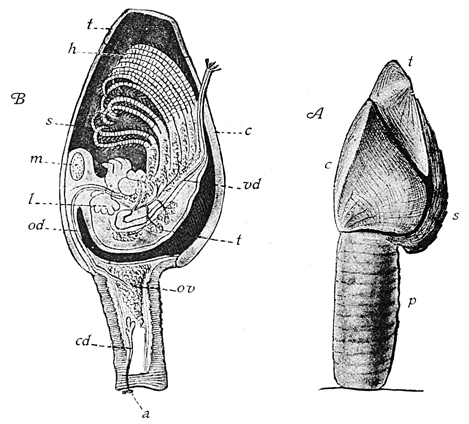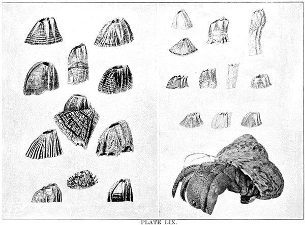 The first objects on the rocky beach to attract attention are the barnacles and rockweeds. They are conspicuous in their profusion, the former incrusting the rocks with their white shells, and the latter forming large beds of vegetation; yet both are likely to be passed by with indifference because of their plentifulness. They are, however, not only interesting in themselves, but associated with them are many organisms which are easily overlooked. The littoral zone is so crowded with life that there is a constant struggle for existence,—even for standing-room, it may be said,—and no class of animals has undisputed possession of any place. Therefore the collector should carefully search any object he gathers for other organisms which may be upon it, under it, or even in it, such as parasites, commensals, and the organisms which hide under it or attach themselves to it for support. Let the rockweed (Fucus) be carefully examined. Among the things likely to be found attached to its fronds are periwinkles (Littorina litorea), which simulate the plant in color, some shells being striped for closer mimicry. Sertularian hydroids also are there, zigzagging over the fronds or forming tufts of delicate horny branches upon them. Small jelly-like masses at the broad divisions of the fronds may be compound ascidians. Calcareous spots here and there may be polyzoans of exquisite form, while spread in incrusting sheets over considerable spaces are other species of Polyzoa. Tiny flat shelly spirals are the worm-cases of Spirorbis. A pocket-lens is essential to enable one to appreciate the beauty of these minute forms. Under the rockweeds are many kinds of crustaceans; perhaps there will also be patches of the pink urn-like egg-capsules of Purpura at the base of the fucus.