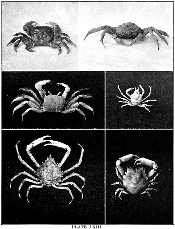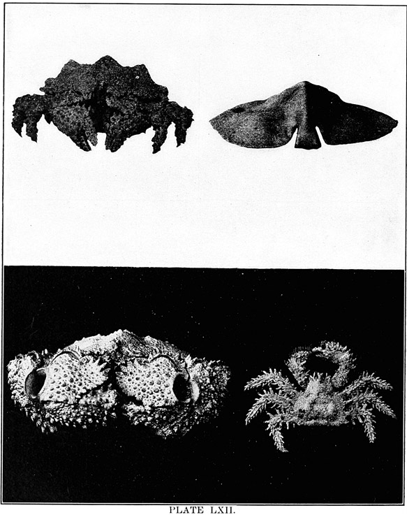 In the clefts and crannies of the rocks are various fine seaweeds, often of the red varieties, sea-anemones, hydroids, polyzoans, crustaceans, mollusks, and ascidians. Crabs will be snugly [pg010] ensconced under projecting surfaces. Most species are more plentiful at the lowest-water mark, and many are found only at this point and below.