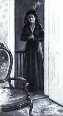 "The big front door opened (it was nearly dark by that time) and out crept the queerest little figure! It appeared to be a little old woman all dressed in dingy black clothes that looked as if they must have come out of the ark, they were so old-fashioned! Her hat was a queer little bonnet, with no trimming except a heavy black veil that came down over her face. She had a small market-basket on her arm, and a big old umbrella.