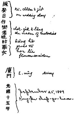 "After a few months he had saved a sufficient sum, and sent off to Shanghai for his coveted treasure—he couldn't wait to get it[Pg 236] over from America! After it came he was actually happy—for a while. He was a marvelous musician for his age, I'll admit, and he could hold us spellbound an entire evening at a time with his bow. The natives adored him, and gave him the name 'Chok-gà k ê lâng' or 'maker of melodies.'