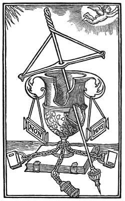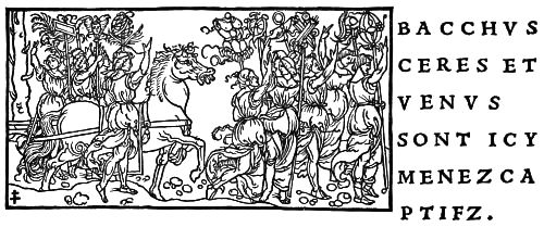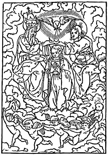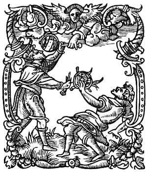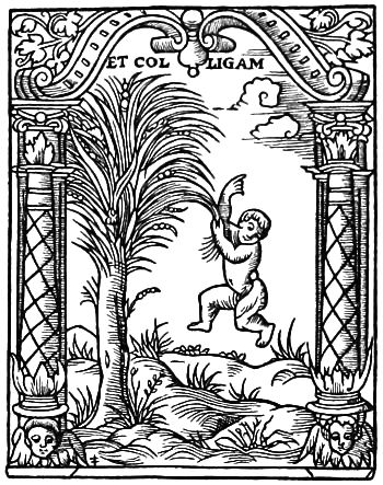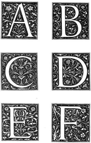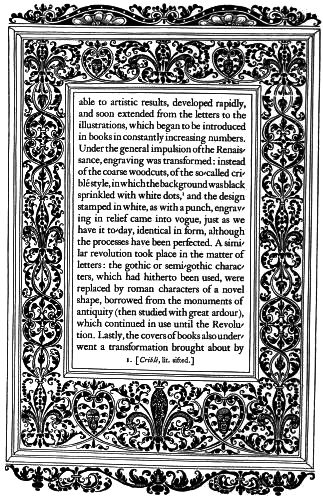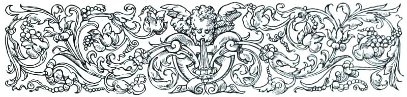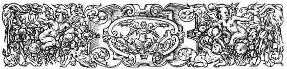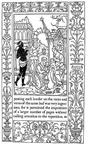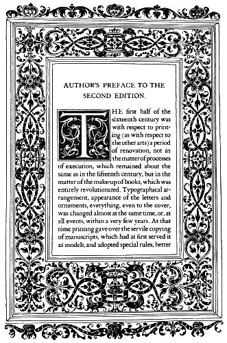 A word regarding the method of reproduction of these illustrations may not be out of place here. More was aimed at than mere photographic copies, which are in many ways inadequate. It was thought desirable to make the decorations an integral part of the typographic treatment of the volume and to preserve when practicable their original relations to the type. To attain this end, more perfect printing plates were necessary than could be obtained directly from the old editions. The designs, therefore, were all redrawn with the greatest care over photographs of the originals, and from these drawings photo-engravings made, which were afterward perfected by hand when the forms were on the press.