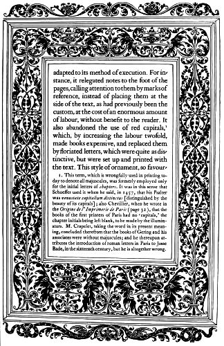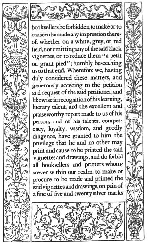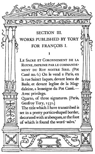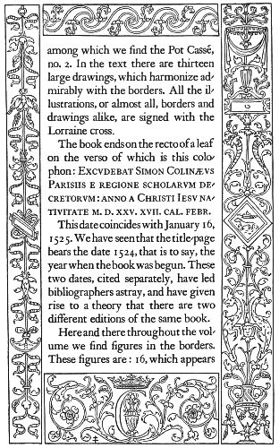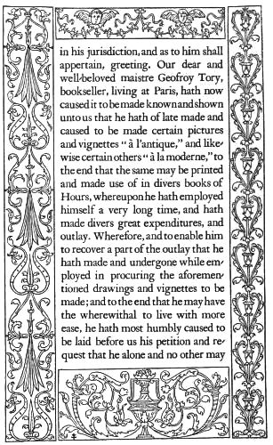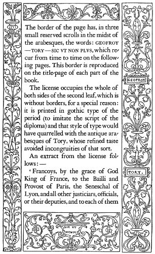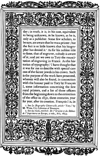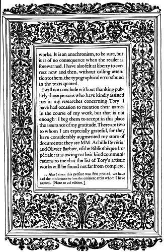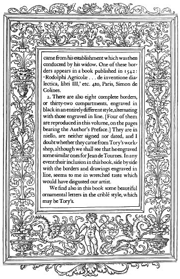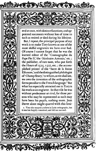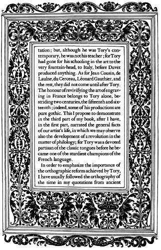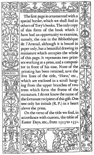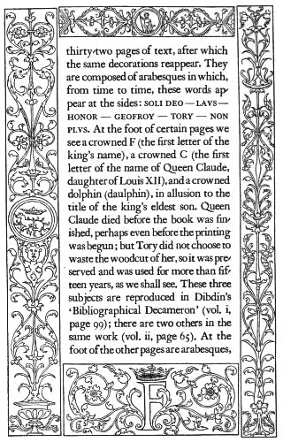 Notwithstanding some inevitable slight divergences of line, this method preserves with far greater faithfulness the spirit and effect of the original prints, and the result is more truly a facsimile than a direct photographic copy would have been. Both drawing and engraving of Tory's designs were exquisite, and as a rule they were beautifully printed, especially by Colines and Robert Estienne. Some of them, however, suffered at the hands of inferior printers. Imperfections and irregularities due to the carelessness or unskilfullness of the printer are readily discernible, and in the reproductions in this volume have been eliminated. The preservation, by this treatment, of more of the beauty and interest of the originals is sufficient justification for departing to this extent from the usual methods of facsimile reproduction.