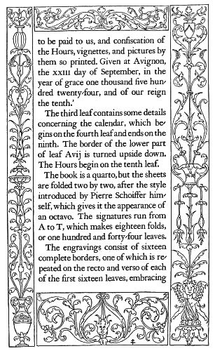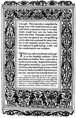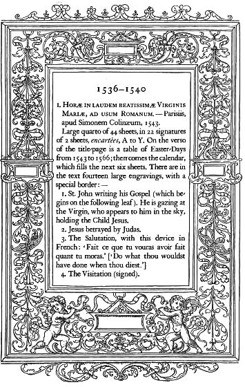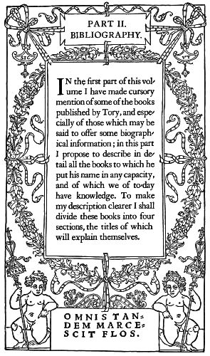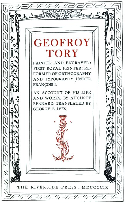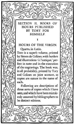 That so much has come to hand in so haphazard a way is but an additional proof of Tory's industry and versatility. There seems to be almost no limit to the work which may fairly be credited to him, and M. Bernard hardly exaggerated when he said that there was scarcely an illustrated volume of any importance issued in Paris during the first half of the XVI th century in which the artist of the Lorraine cross did not have a hand. Hours and Classics, Bibles and Testaments, Mathematical and Medical works—all bear evidence to his prolific pen and graver, and were time disregarded, the preparation of this volume might be almost indefinitely prolonged. Incomplete as it is, however, it is hoped that it will measurably fulfill the desire expressed by Mr. A. W. Pollard nearly fifteen years ago, in the first issue of 'Bibliographica.' Speaking of Bernard's monograph, he said, 'It would be pleasant if some French publisher would bring out a new edition worthily illustrated, for in 1865 the modern processes of reproduction were not yet invented, and the few and poor woodcuts in M. Bernard's book give no just idea of the artistic powers of Tory, whose illustrated editions are so difficult to meet with that M. Bernard's admirable commentary loses half its value for lack of a proper accompaniment of text.'