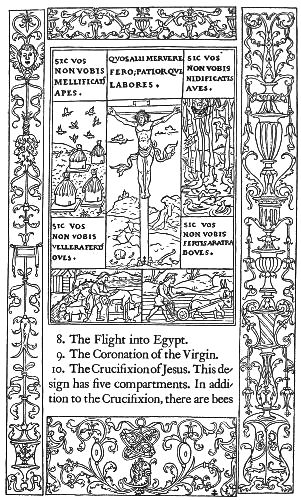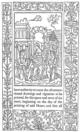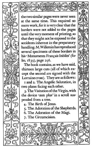 The printer of this volume has had more than ordinary good fortune in literally stumbling upon most of the designs here reproduced. The pressure of other work has prohibited systematic research, and the originals of these illustrations were nearly all discovered while he was engaged upon other matters. Many were found in the Harvard Library, some in the reference library of the Riverside Press, some in auction rooms, and some in booksellers' catalogues. The only exception is the series of borders from the Hours of 1524-25, which were expressly photographed from the copy in the library of the British Museum.