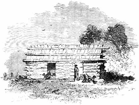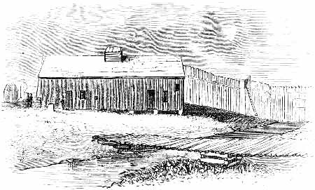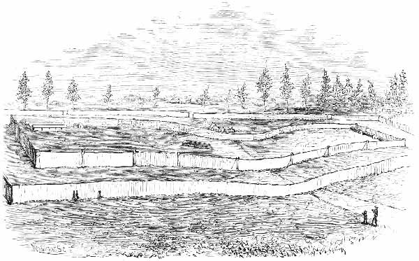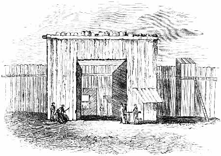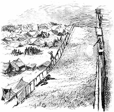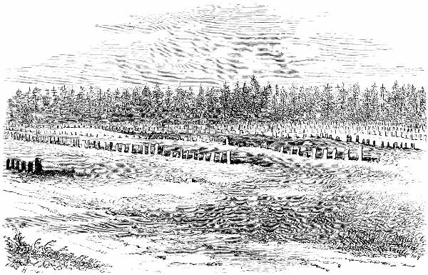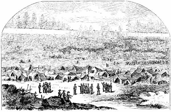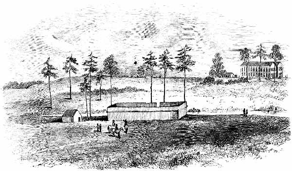 A dense forest of primeval trees covered the spot which was selected by the engineers when they marked out the line of the prison. The massive pines were levelled by the strong arms of several hundred negro slaves, and when their branches were cut away, they were placed side by side, standing upright in the deep ditches, which were excavated with regularity, and in parallel lines, north and south, east and west. Thus were formed the boundaries of the palisade, wherein nearly forty thousand human beings were to be herded at one time. [Pg 19]The surface of the earth was cleared completely away, so as to give full play to the elements of destruction.