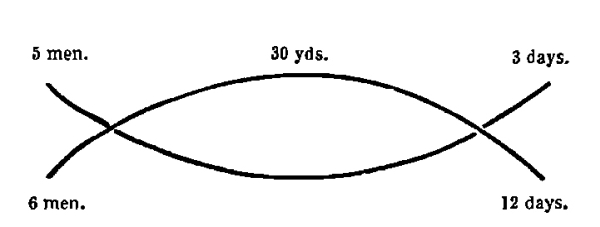 [49] This generally comes in the same member of the sentence. In some cases the ingenuity of the student must be employed in detecting it. The reasoning of (238) is the best guide. The following may be very often applied. If it be evident that the answer must be less than the given quantity of its kind, multiply that given quantity by the less of the other two; if greater, by the greater. Thus, in the first question, 156 yards must cost more than 22; multiply, therefore, by 156.