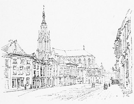 Somehow, like most travellers, we could not help expecting to see some marked change on reaching a new country, and in Holland one could not repress the expectation of beginning at once to see the pictures of Teniers and Gerard Dou in real life. We were certainly disappointed at first. Open heaths were succeeded by woods of stunted firs, and then by fields with thick hedges of beech or alder, till the towers of Breda came in sight. Here a commonplace omnibus took us to the comfortable inn of Zum Kroon, and we were shown into bedrooms reached by an open wooden staircase from the courtyard, and quickly joined the table d'hôte, at which the magnates of the town were seated with napkins well tucked up under their chins, talking, with full mouths, in Dutch, of which to [4]our unaccustomed ears the words seemed all in one string. Most excellent was the dinner—roast meat and pears, quantities of delicious vegetables cooked in different ways, piles of ripe mulberries and cake, and across the little garden, with its statues and bright flower-beds, we could see the red sails of the barges going up and down the canals.