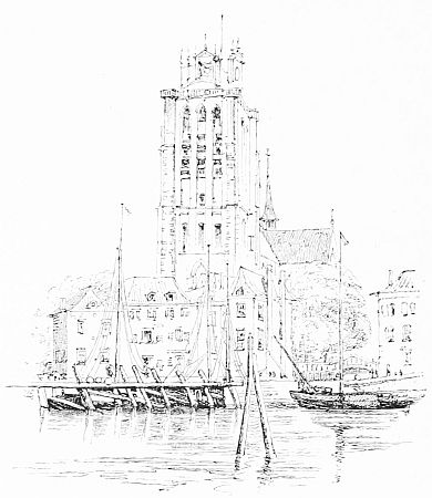 From the busy port, where nevertheless they are dredging, we cross another bridge and find ourselves in a quietude like that of a cathedral close in England. On one side is a wide pool half covered with floating timber, and, in the other half, reflecting like a mirror the houses on the opposite shore, with their bright gardens of lilies and hollyhocks, and trees of mountain ash, which bend their masses of scarlet berries to the still water. Between the houses are glints of blue river and of inevitable windmills on the opposite shore. And all this we observe standing in the shadow of a huge church, the Groote Kerk, with a nave of the fourteenth century, and a choir of the fifteenth, and a gigantic brick tower, in which three long Gothic arches, between octagonal tourelles, enclose several tiers of windows. At the top is a great clock, and below the church a grove of elms, through which fitful sunlight falls on the grass and the dead red of the brick pavement (so grateful to feet sore with the sharp stones of other Dutch cities), where groups of fishermen are collecting in their blue shirts and white trousers.