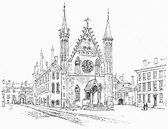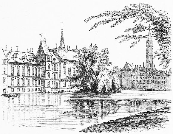 It is a brief journey to the Hague—La Haye, Gravenhage—most delightful of little capitals, with its comfortable hotels and pleasant surroundings. The town is still so small that it seems to merit the name of 'the largest village in Europe,' which was given to it because the jealousy of other towns prevented its having any vote in the States General till the time of [21]Louis Bonaparte, who gave it the privileges of a city. It is said that the Hague, more than any other place, may recall what Versailles was just before the great revolution. It has thoroughly the aspect of a little royal city. Without any of the crowd and bustle of Amsterdam and Rotterdam, it is not dead like the smaller towns of Holland; indeed, it even seems to have a quiet gaiety, without dissipation, of its own. All around are parks and gardens, whence wide streets lead speedily through the new town of the rich bourgeoisie to the old central town of stadholders, where a beautiful lake, the Vijver, or fish-pond, comes as a [22]surprise, with the eccentric old palace of the Binnenhof rising straight out of its waters. We had been told it was picturesque, but were prepared for nothing so charming as the variety of steep roofs and towers, the clear reflections, the tufted islet, and the beautiful colouring of the whole scene of the Vijver. Skirting the lake, we entered the precincts of the palace through the picturesque Gudevangen Poort, where Cornelius de Witte, Burgomaster of Dort, was imprisoned in 1672, on a false accusation of having suborned the surgeon William Tichelaur to murder the Prince of Orange. He was dragged out hence and torn to pieces by the people, together with his brother Jean de Witte, Grand Pensioner, whose house remains hard by in the Kneuterdijk.