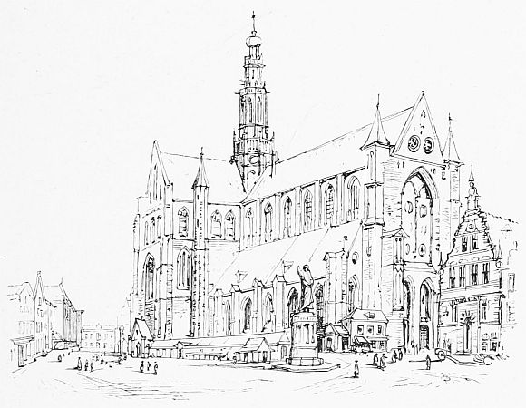 Haarlem, on the river Spaarne, stands out distinct in recollection from all other Dutch towns, for it has the most picturesque market-place in Holland—the Groote Markt—surrounded by quaint houses of varied outline, amidst which rises the Groote Kerk of S. Bavo, a noble cruciform fifteenth-century building. The interior, however, is as bare and hideous as all other Dutch churches. It contains a monument to the architect Conrad, designer of the famous locks of Katwijk, 'the defender of Holland against the fury of the sea and the power of [36]tempests.' Behind the choir is the tomb of the poet Bilderdijk, who only died in 1831, and near this the grave of Laurenz Janzoom—the Coster or Sacristan—who is asserted in his native town, but never believed outside it, to have been the real inventor of printing, as he is said to have cut out letters in wood, and taken impressions from them in ink, as early as 1423. His partisans also maintain that whilst he was attending a midnight mass, praying for patience to endure the ill-treatment of his enemies, all his implements were stolen, and that when he found this out on his return he died of grief. It is further declared that the robber was Faust of Mayence, the brother of Gutenberg, and that it was thus that the honour of the invention passed from Holland to Germany, where Gutenberg produced his invention of movable type twelve years later. There is a statue of the Coster in front of the church, and, on its north side, his house is preserved and adorned with his bust.