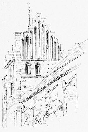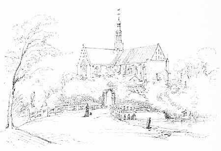 The crowd in the market-place was so great that it was impossible to sketch the Stadhuis as we should have wished, but the people themselves were delightfully picturesque. The women entirely conceal their hair under their white caps, but have golden corkscrews sticking out on either side the face, like weapons of defence, from which the golden slabs we have observed before were pendant. The Nieuwe Kerk is of little interest, though it contains the tomb of William of Holland, who was elected Emperor of Germany in 1250, and we wandered on through the quiet streets,[11] till a Gothic arch in an ancient wall looked tempting. Passing through it we found ourselves in the enclosure of the old abbey, shaded by a grove of trees, and surrounded by ancient buildings, part of which are appropriated as the Hotel Abdij, where we arrived utterly famished, and found a table d'hôte at 2.30 P.M. unspeakably reviving.