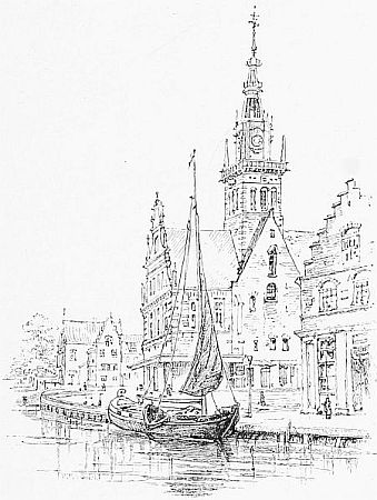 So, crossing a broad salt canal into the island of Walcheren, we reached Middleburg, a handsome town which was covered with water to the house tops when [10]the island was submerged. It was the birthplace of Zach Janssen and Hans Lipperhey, the inventors of the telescope, c.1610. In the market-place is a most beautiful Gothic townhall, built by the architect Keldermans, early in the sixteenth century. We asked a well dressed boy how we could get into it, and he, without further troubling himself, pointed the way with his finger. The building contains a quaint old hall called the Vierschaar, and a so-called museum, but there is little enough to see. As we came out the boy met us. 'You must give me something: I pointed out the entrance of the Stadhuis to you.' In Holland we have always found that no one, rich or poor, does a kindness or even a civility for nothing!