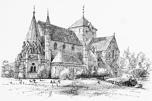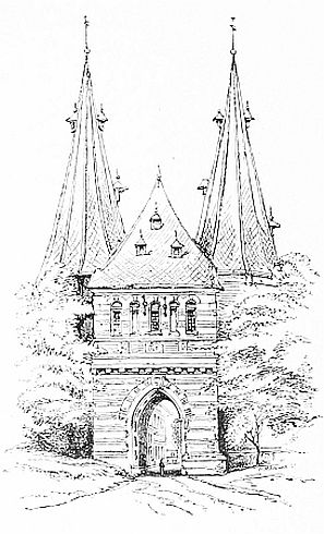 On leaving Groningen we traversed the grey, monotonous, desolate district of the Drenthe, sprinkled over at intervals by the curious ancient groups of stones called Hunnebedden, or beds of death (Hun meaning death), beneath which urns of clay containing human ashes have been found. From Deventer (where there is an old weigh-house, and a cathedral of S. Lievin with a crypt and nave of 1334), time did not allow us to make an excursion to [56]the great royal palace of Het Loo, the favourite residence of the sovereigns. The descriptions in Harvard rather made us linger unnecessarily at Zutphen, a dull town, with a brick Groote Kerk (S. Walpurgis) which has little remaining of its original twelfth-century date, and a rather picturesque 'bit' on the walls, where the 'Waterpoort' crosses the river like a bridge.