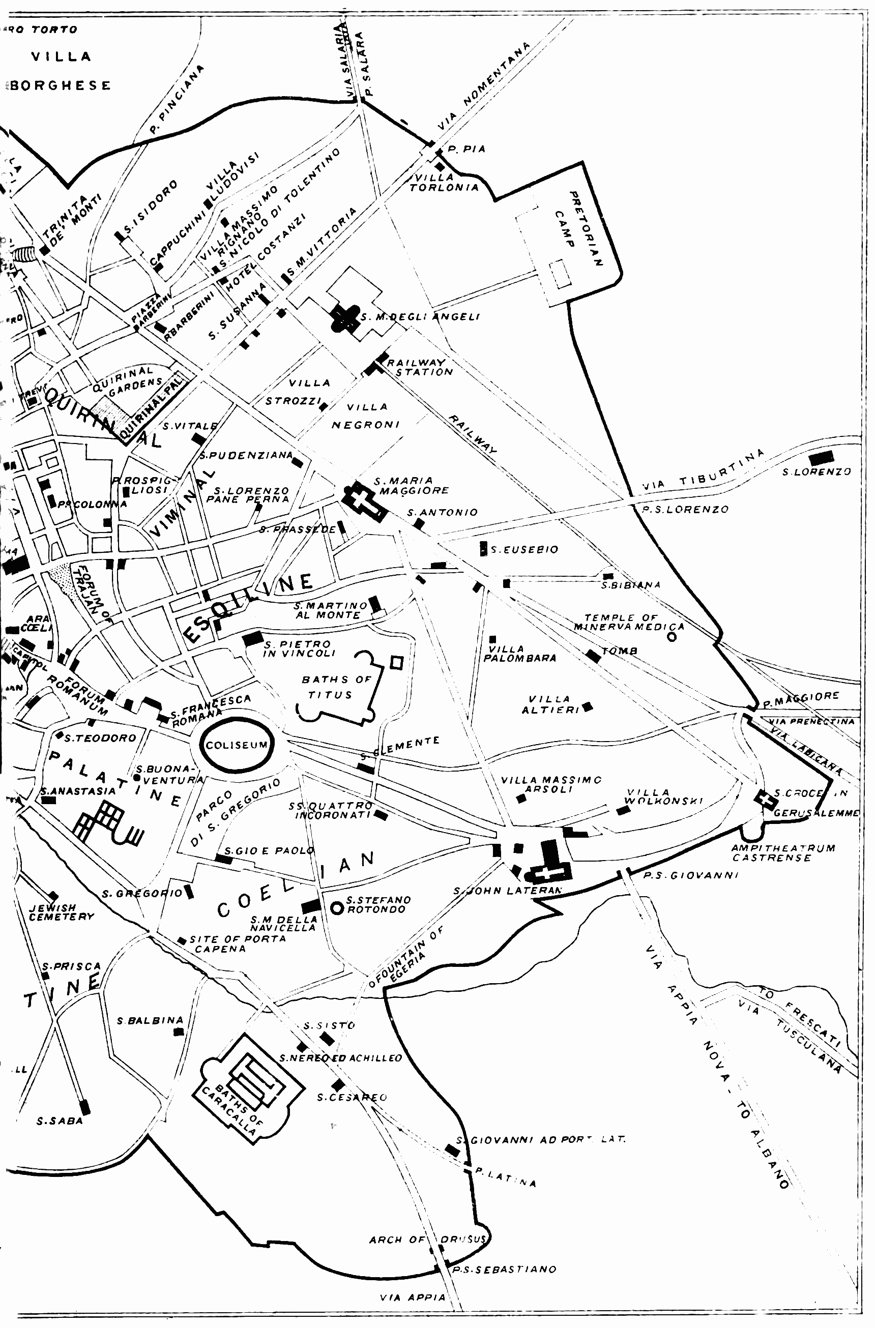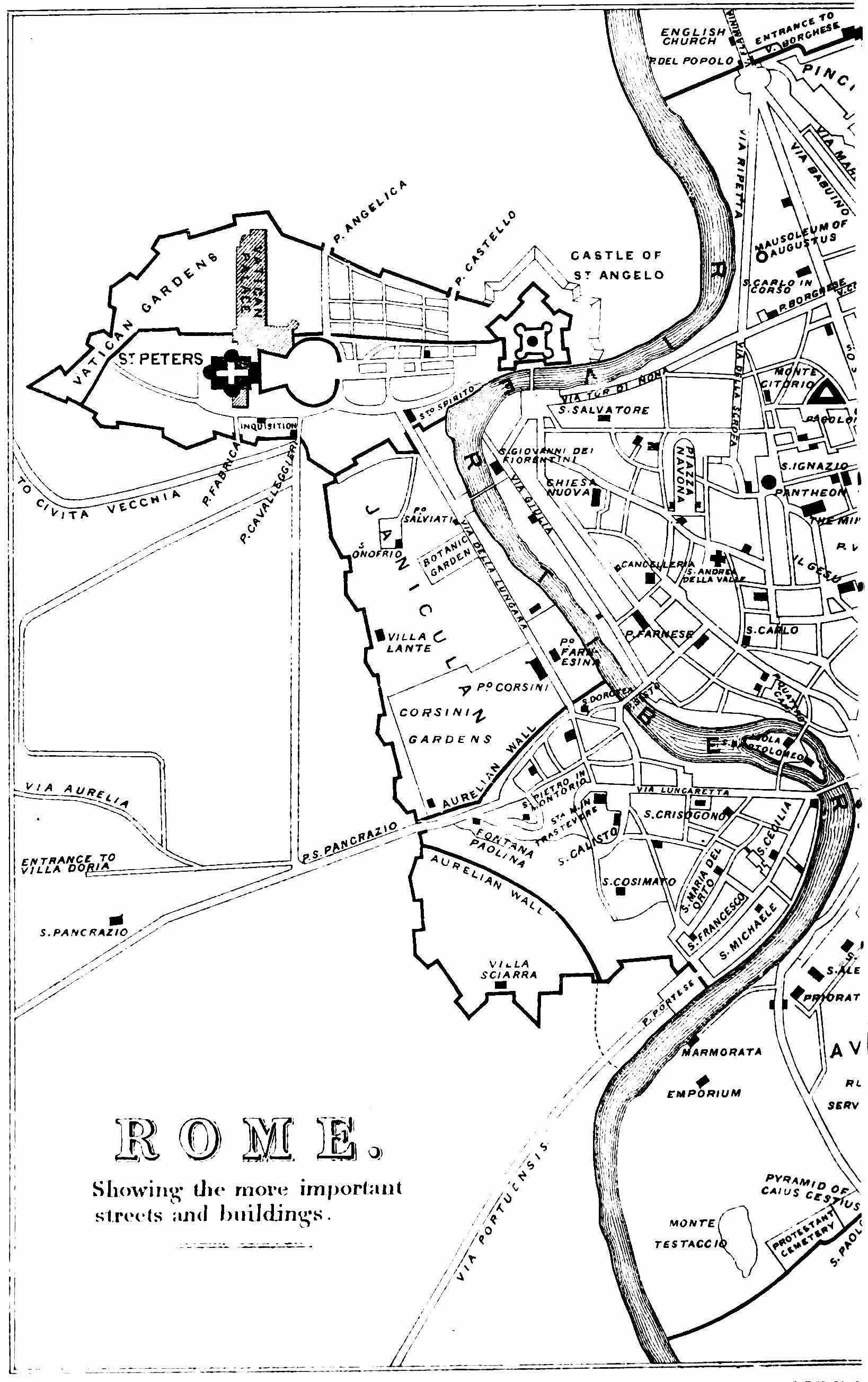 Yet, in spite of the presence of old friends and landmarks, travellers who pay a hurried visit to Rome, are bewildered by the vast mass of interest before them, by the endless labyrinth of minor objects, which they desire, or, still oftener, feel it a duty, to visit. Their Murray, their Baedeker, and their Bradshaw indicate appalling lists of churches, temples, and villas which ought to be seen, but do not distribute them in a manner which will render their inspection more easy. The promised pleasure seems rapidly to change into an endless vista of labour to be fulfilled and of fatigue to be gone through; henceforward the hours spent at Rome are rather hours of endurance than of pleasure—his cicerone drags the traveller in one direction,—his antiquarian friend, his artistic acquaintance, would fain drag him in others,—he is confused by accumulated misty glimmerings from historical facts once learnt at school, but long since forgotten,—of artistic information, which he feels that he ought to have gleaned from years of society, but which, from want of use, has never made any depth of impression,—by shadowy ideas as to the story of this king and that emperor, of this pope and that saint, which, from insufficient time, and the absence of books of reference, he has no opportunity of clearing up. It is therefore in the hope of aiding some of these bewildered ones, and of rendering their walks in Rome more easy and more interesting, that the following chapters are written. They aim at nothing original, and are only a gathering up of the information of others, and a gleaning from what has been already given to the world in a far better and fuller, but less portable form; while, in their plan, they attempt to guide the traveller in his daily wanderings through the city and its suburbs.