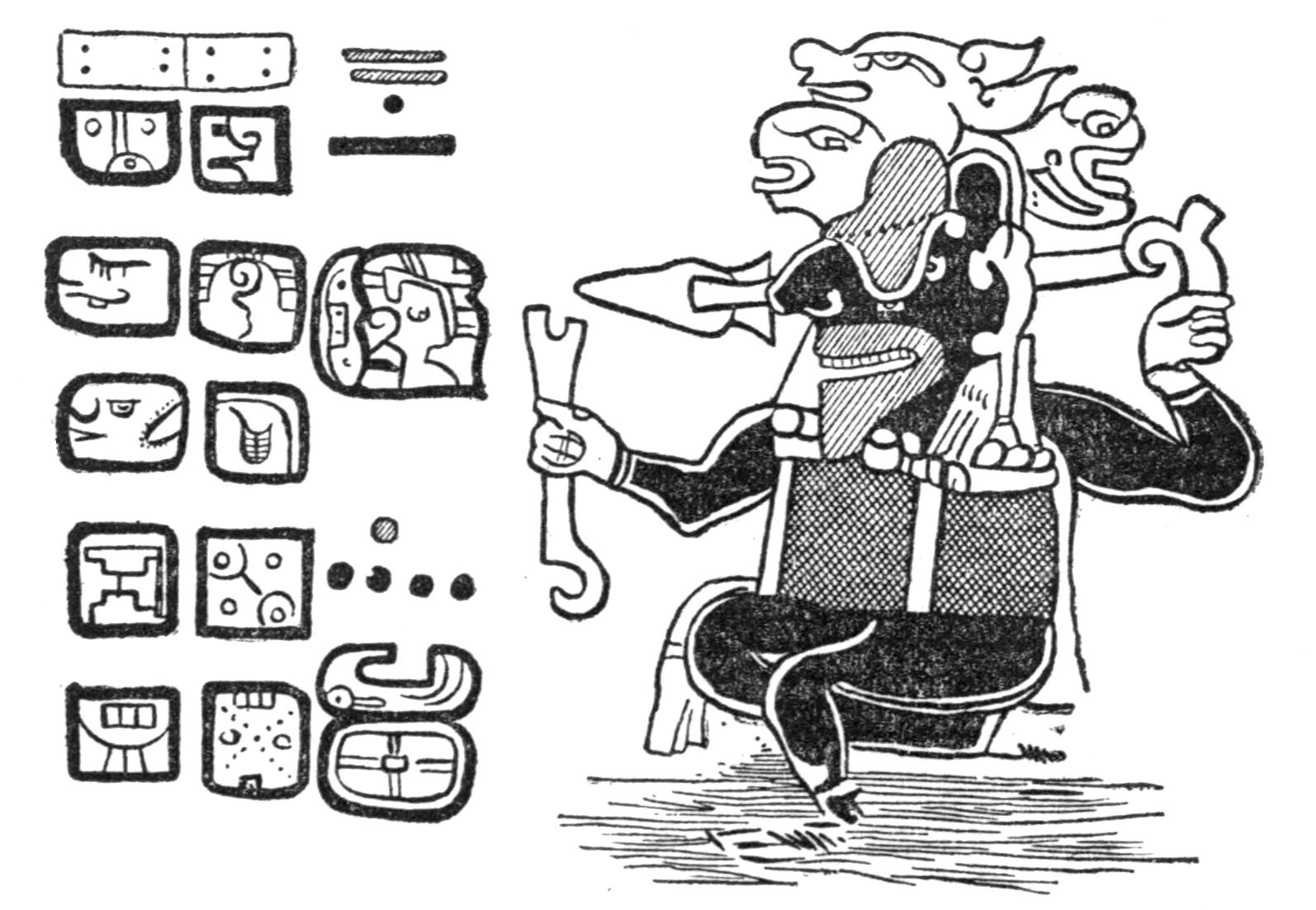 The Maya writers, as the author of the Troano, etc., sometimes represented the Earth under the figure of an old woman and called it mam—the grandmother. She is here represented holding in her left hand the sign of the smoke, and darting a javelin emblem of the volcanic energy, and in her right hand she holds the symbol of the "Land of the Scorpion" "Zinaan," the West India Islands of our days. The deer head represents the Maya Empire.