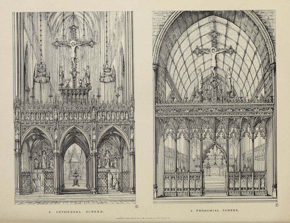At Aix-la-Chapelle, a city reported, and, I believe, with truth, to be full of devout persons, the Dom is incumbered with houses and shops for the sale of snuff-boxes, pipes, and tobacco, between every buttress of the apsis surrounding the high altar, and the owners of these habitations are driving their bargains and cooking their victuals within a few feet of the high altar of a church which is the depository of the most venerable reliques of Europe. I mention these things to show how sadly the ancient reverence of sacred buildings and things has declined in latter times, and most assuredly they are intimately connected with the screen question. Rites so sacred as those of the {106} Catholic church require every watchfulness, both in conduct and in externals, to preserve them in due veneration; and an irreverent arrangement in the construction of a church may be the cause of infinite sin and scandal. Now, therefore, that we are beginning, as it were, de novo, to restore the churches of God, how important is it that we should so construct them, that they may by their symbolic and ancient fashion, set forth the stupendous mysteries for whose celebration they are raised, and, at the same time, prove them to belong to that very faith that generated, centuries ago, those great principles of Christian art which we may rival, but scarcely excel!