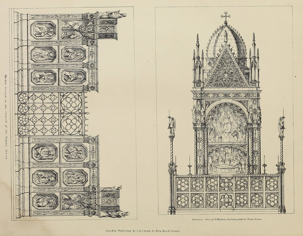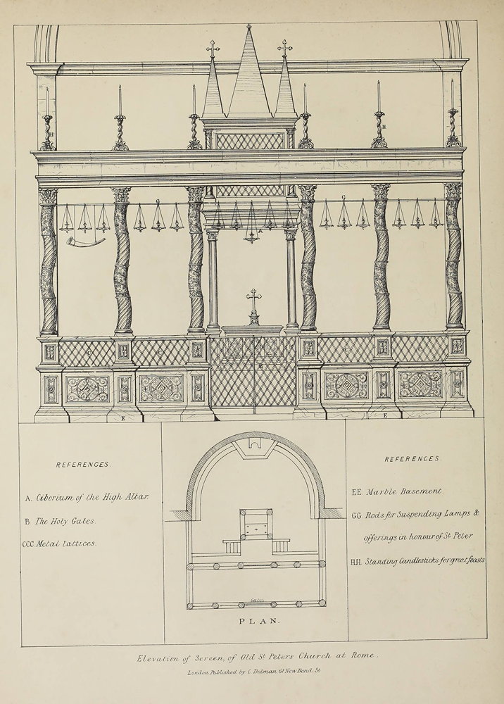 It now only remains to make some remarks on the recent revival of Catholic art and architecture, the difficulties with which it has to contend in England, and the opposition that has been raised against it. As the enclosures of the sanctuary can be traced from the erection of the earliest Christian churches, and as they are inseparably connected with reverence and solemnity, we might have hoped, and indeed expected, that the restoration would have been hailed by all who profess the ancient religion as an evidence of returning faith. But, alas, we have a class of men to oppose the revival of ancient symbolism, on whom the examples of fifteen centuries of Catholic antiquity fail to produce the slightest recognition of respect. The past is to them a nullity, and they would fain have us believe that the present debased externals of religion are to be equally received and propagated as those which were generated during the finest ages of Christian art. Now, knowing the whole history of this debasement in religious art, its origin and progress, and the general decline of Catholic faith and Catholic principles, corresponding to its increasing influence, it is impossible for us to regard its very existence otherwise than as an intolerable evil, and we must labour incessantly for its utter expulsion from our churches. The decline of true Christian art and architecture may be dated from a most corrupt era in the history of the church; and ever since that most unnatural adoption of Pagan externals for Catholic rites, we mourn the loss of those reverend and solemn structures which so perfectly embodied the {101} faith for which they were raised. Bad as was the Paganism of the fifteenth and sixteenth centuries, it was dressed out in much external majesty and richness; but now nothing is left but the fag end of this system; bronze and marble are replaced by calico and trimmings; the works of the sculptor and the goldsmith are succeeded by the milliner and the toyshop; and the rottenness of the Pagan movement is thinly concealed by gilt paper and ribands,—the nineteenth century apeings of the dazzling innovations of the Medician era. Cheap magnificence, meretricious show, is the order of the day; something pretty, something novel, calico hangings, sparkling lustres, paper pots, wax dolls, flounces and furbelows, glass cases, ribands, and lace, are the ornaments and materials usually employed to decorate, or rather disfigure, the altar of sacrifice and the holy place. It is impossible for church furniture and decoration to attain a lower depth of degradation, and it is one of the greatest impediments to the revival of Catholic truth. It is scarcely possible for men to realize the awful doctrines and the majestic ritual of the Church under such a form; and yet these wretched novelties are found on the altars of some of the most venerable temples, equally as in the abortions of modern erection. They disfigure alike the cathedral of the city and the wayside chapel of the mountain-pass; they flourish in religious communities, and are even tolerated in the seminaries for the education of the priests of the sanctuary. Bad, paltry, miserable taste has overrun the externals of religion like a plague; and to this state of deplorable degradation would these new men bind our desires and intellects, as if it were of God, and on a par with the noble works achieved in times of zeal and faith, and at a period when all the art and talent of Christendom was devoted to the one object of increasing the glory and magnificence of the great edifices devoted to the worship of Almighty God. Moreover, it is very important to observe the extraordinary similarity of idea that actuated the artists of all Christian countries during the middle ages. Making due allowance for climate and materials, the same ruling {102} spirit presided over the arts of Italy and England. The same devout effigies, recumbent and praying, each robed in the flowing ecclesiastical habits of the order, may be seen in every old Italian church, as in our own cathedrals. There was no difference then between a Roman chasuble and an English chasuble, between a Roman mitre and an English mitre. The same beautiful forms and proportions reigned universal. Even where the Christians extended their conquests in the East, in the city of Jerusalem itself, the edifices they raised were in architecture Pointed and Christian; some of which even still remain. Everywhere the Catholic might be traced by the works he raised; but now, alas, excepting by the extreme ugliness, and deformity, and paltry ornament, that are the usual characteristics of modern Catholic erections, it would be difficult to distinguish them from the recent productions of modern sects. Is it not a consideration that should fill every true Catholic heart with grief, that the propagation of the faith is no longer attended by the propagation of ecclesiastical traditions? Every year what zealous missionaries depart for distant climes, bearing with them, indeed, the true principles of faith, but with it the most degraded externals possible. The sources from whence they supply themselves are the magazines of Lyons and Paris, places filled with objects made entirely on the principle of cheap magnificence, uncanonical in form and often in material, hideous in design, utter departures from the beautiful models of mediæval antiquity, calculated only to please the vulgar and the ignorant, dazzling in the eyes of savages, but revolting to every man of true ecclesiastical knowledge and feeling. These things are not only expedited to the colonies and even to the antipodes to form in any mission a fresh nucleus of deplorable taste and ideas, but they inundate the sister island itself; yes, in Ireland, where, even in times considered barbarous, the ancient goldsmiths wrought exquisitely cunning work for the altar and the shrine, they now deck out her sanctuaries in Parisian trumpery, and borrow the model of her churc