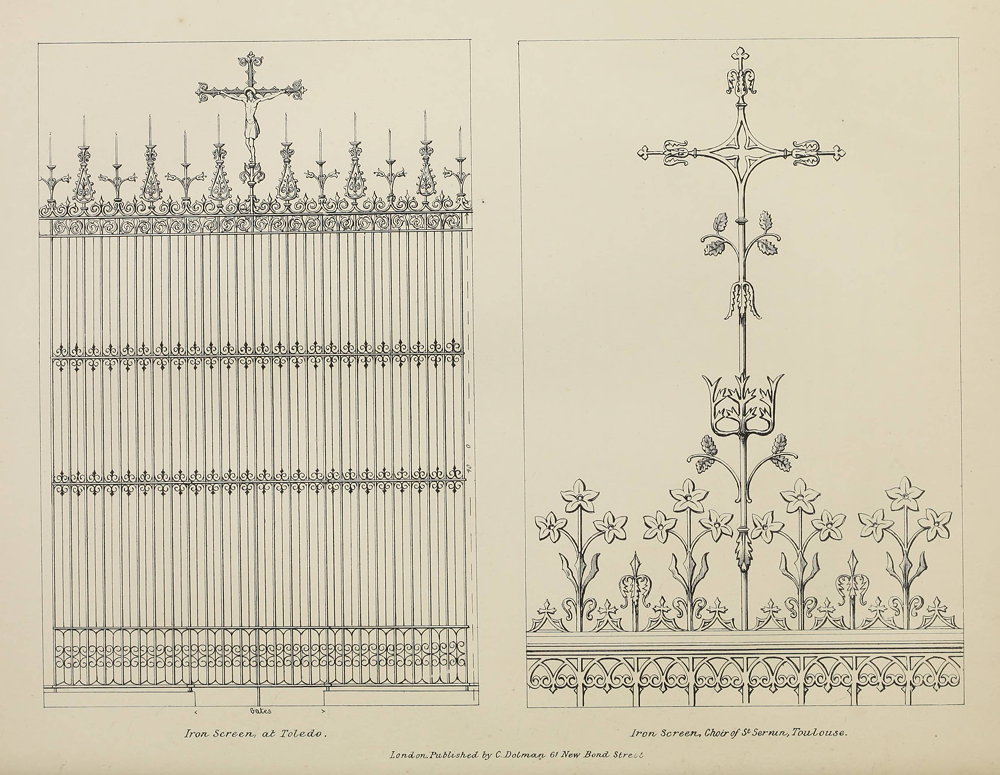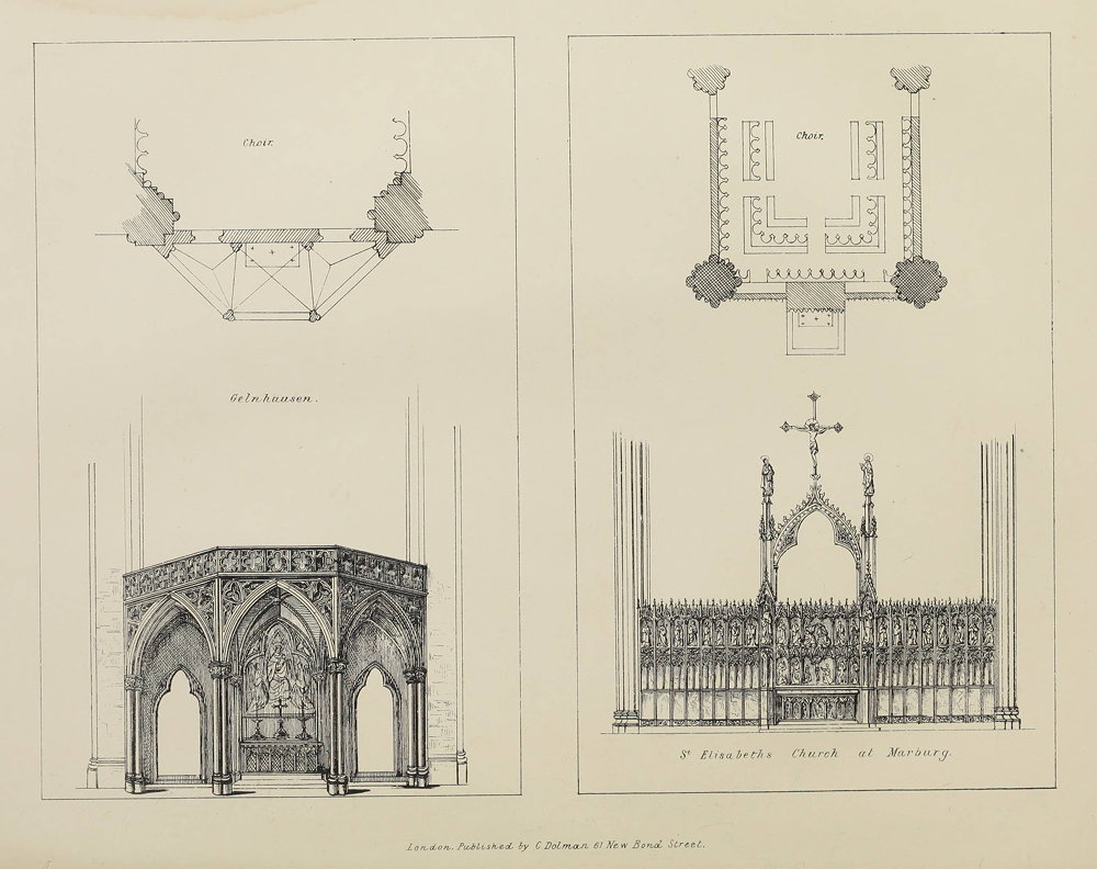 I therefore most earnestly conjure all those men who profess to revive true architecture to look to the wants and circumstances of the time, not to sacrifice principles, but to prove that the real principles can combine with any legitimate requirement of religion; let the bishops and clergy practically perceive that Christian architecture fulfils perfectly all their wants: let there be light, space, ventilation, good access, with the absence of drafts, which destroy devotion and excite prejudice against Pointed doorways. Avoid useless and over-busy detail, and rely on good proportions and solemnity of effect. {124} Above all, we must remember that everything old is not an object of imitation—everything new is not to be rejected. If we work on these golden principles, the revival would be a living monument, as it was in days of old; and that God may grant us means to carry it out, that he will enlighten the hearts of the obdurate, and unite the faithful in one great bond of exertion for the revival of the long-lost glory of his church, sanctuary, and altar, is the earnest prayer of the writer of this book.