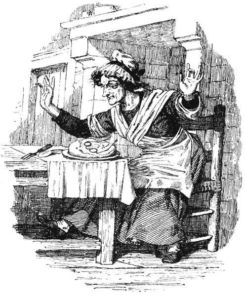 Then she went to the cupboard and got a plate, and then to the knife-box and got a knife; then she took the fork from the mantelpiece, and drew her arm-chair close up to the table, and sat down in it, and cut off a piece of the dumpling, and put it on her plate.
