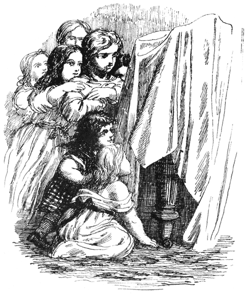 Oh how the children did wish to peep! They could not look at anything else; they danced and jumped round the table, and were in a great hurry for their Grandpa. In a few minutes he came into the room, and all the children ran up to him and said, "Dear Grandpa, do let us see what you have got on the table."