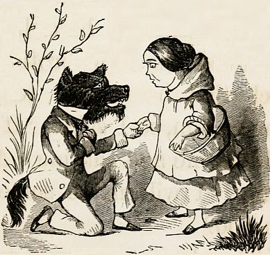 "Then I drew him a picture of the wolf in a bob-tailed coat, talking to Little Red Ridinghood in the wood; and I made[131] him a paper fly-cage, and a paper windmill.