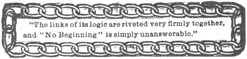 “The links of its logic are riveted very firmly together, and ‘No Beginning’ is simply unanswerable.... The book is a rare gem of precious thought and will do great good in the world.”—Dr. W. H. Gibbon, Chariton, Iowa.